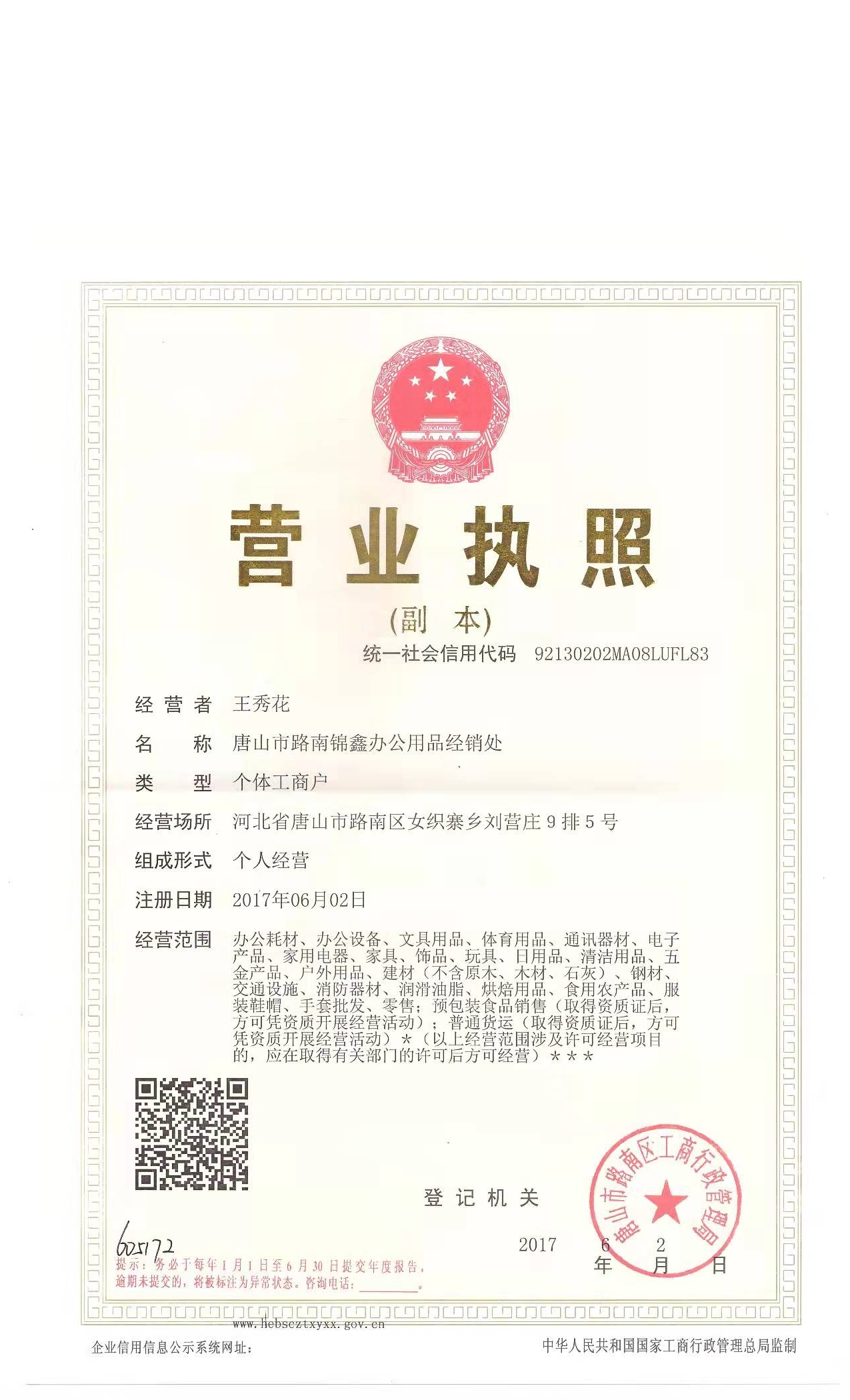 唐山市路南锦鑫办公用品经销处成立于2017-06-02,经营者为王秀花,统一社会信用代码为92130202MA08LUFL83,企业地址位于河北省唐山市路南区女织寨乡刘营庄9排5号,所属行业为零售业,经营范围包含:办公耗材、办公设备、文具用品、体育用品、通讯器材、电子产品、家用电器、家具、饰品、玩具、日用品、清洁用品、五金产品、户外用品、建材(不含原木、木材、石灰)、钢材、交通设施、消防器材、润滑油脂、烘焙用品、食用农产品、服装鞋帽、手套批发、零售;预包装食品销售(取得资质证后,方可凭资质开展经营活动);普通货运(取得资质证后,方可凭资质开展经营活动)*(以上经营范围涉及许可经营项目的,应在取得有关部门的许可后方可经营)***。